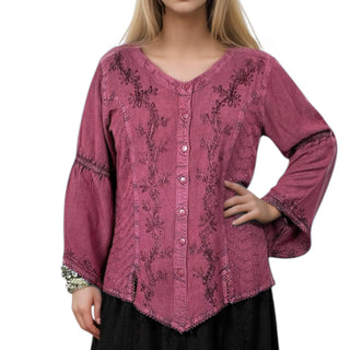 9004 B Women's Bohemian Vintage Sweet Heart Button Down Embroidered Pleated Blouse