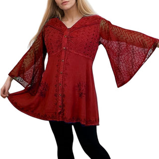 18 607 B Medieval Gothic Embroidered Button Down Sheer Lace Sleeve Top Blouse
