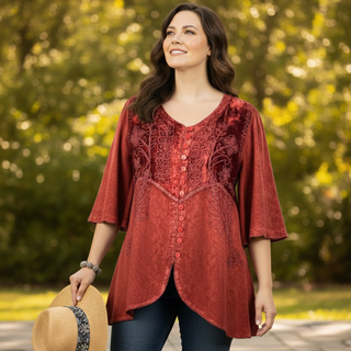 9004 B Women's Bohemian Vintage Sweet Heart Button Down Embroidered Pleated Blouse