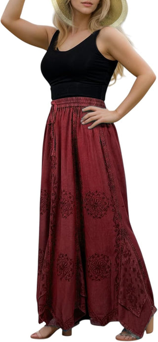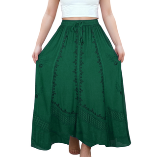 702 SKT Women's Boho Elastic Waistband Embroidered A Line Flared Maxi Skirt