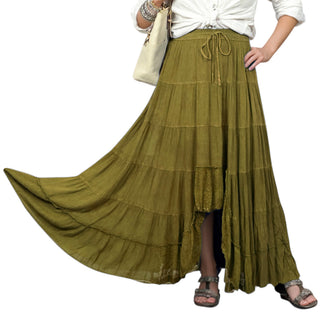 18 6028 SKT Boho Medieval Crepe Tier Elastic Waistband Front Open Long Skirt Maxi