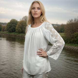 3629 B Rayon Bohemian Medieval Bell Sleeve Color Embroidered Patch Lace Overlay Neckline Tunic Blouse