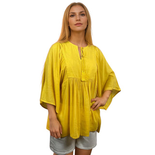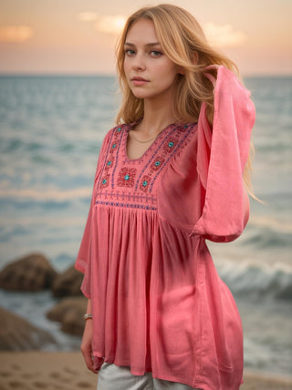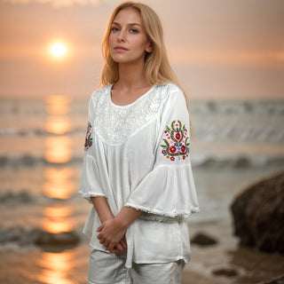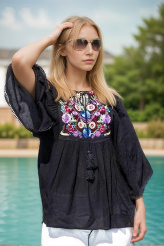3733 B Rayon Crepe Bohemian Bell Sleeve Embroidered Casual Tunic Blouse