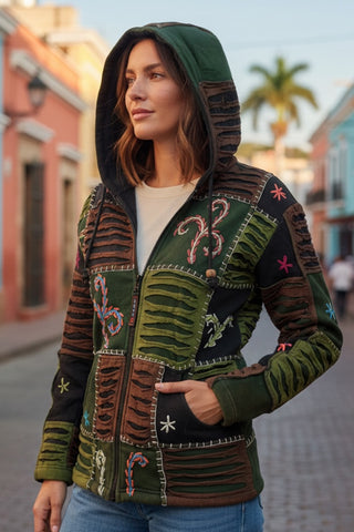 327 RJ Hand Crafted Bohemian Rib Tie-dye Brush Painted Patch Cotton Detachable Pixie Hoodie Jacket
