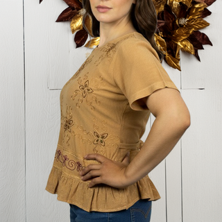 18 6027 B Bohemian Medieval Embroidered Round Neck Ruffle Hem Short Sleeve Blouse Top