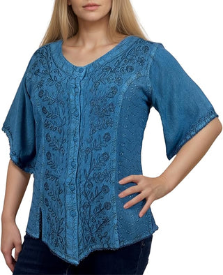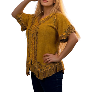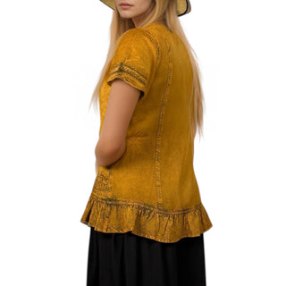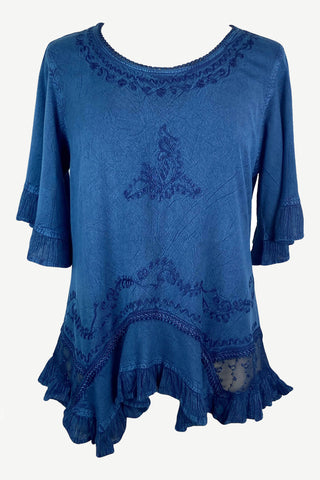 18 6027 B Bohemian Medieval Embroidered Round Neck Ruffle Hem Short Sleeve Blouse Top
